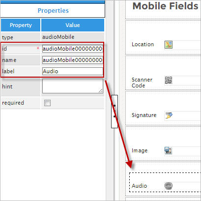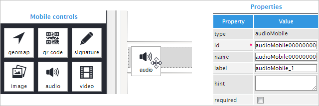 The properties of the Audio control can be found under the Mobile Controls tab. To use the Audio control, simply drag and drop the control into the Dynaform. Click on the blank space of the control field on the Dynaform to display its properties, which are shown in the image below.