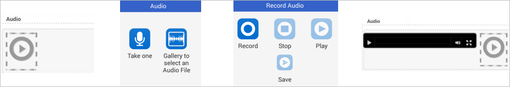 The Mobile app has an Audio control that allows the end user to record sound to upload to a Dynaform. This control can upload an audio clip from the gallery or record a new sound clip and save it in an audio file.