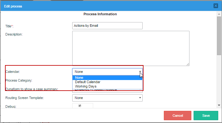 Assign a calendar by opening a process and then right clicking anywhere on a blank area in the map and selecting the Edit Process option. Then, go to the Calendar dropdown and select a Calendar from the list. Click on Save.