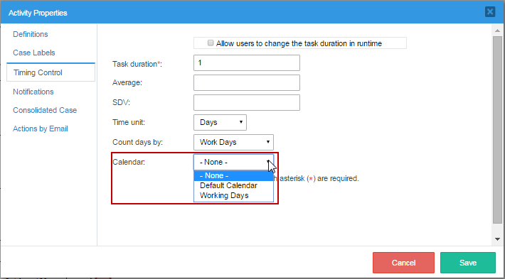 Calendars allow process designers to specify the hours and days when users are expected to be at work, so that the due dates for tasks can be more accurately calculated with Timing Controls. They also allow holidays to be specified, so those days are excluded when calculating the due date. Different calendars can be created for different needs. For instance, a calendar can be created that only includes workdays, but not holidays or weekends, which is useful for calculating salaries.