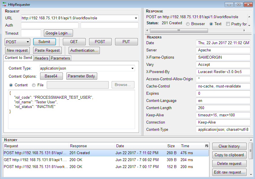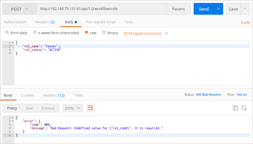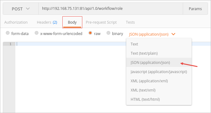 Create a new role using the POST /role endpoint. Change the method from GET to POST and change the URL to http://<processmaker-server>:<port>/api/1.0/<workflow>/role. The Body section will become available. Select raw to set the formatting type to JSON (application/json).