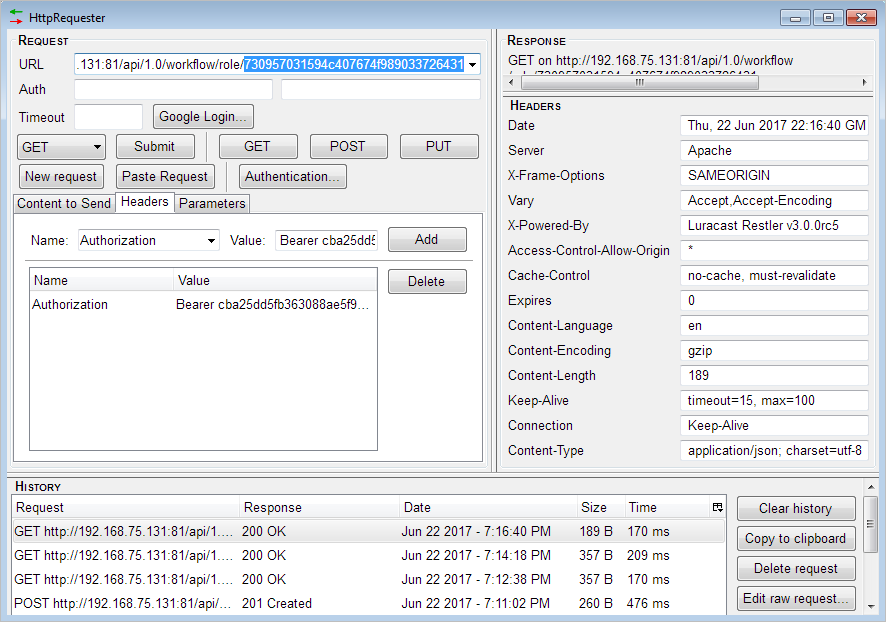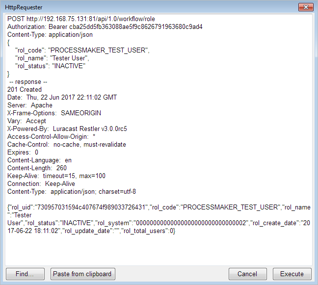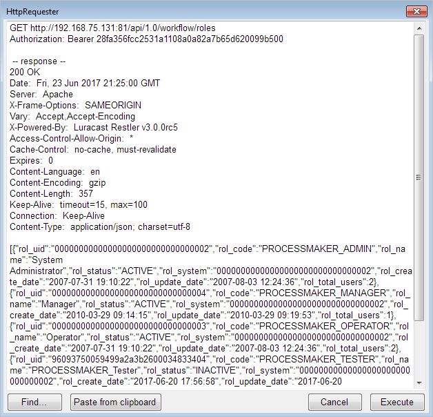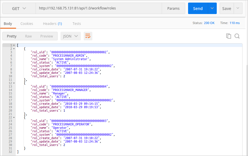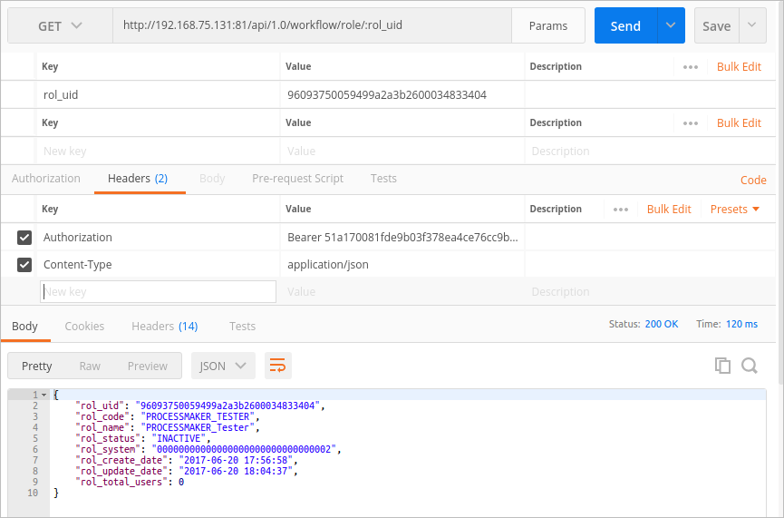 In cases where the endpoint has path parameters, the path parameters must be included manually. For example, to see the information about one particular role, the rol_uid parameter will have to be included manually right after the URL, as shown in the image below.
