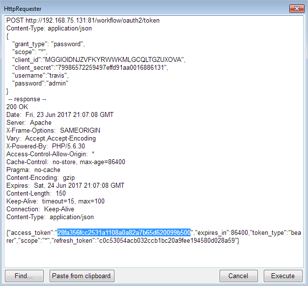 Copy the value of the access_token parameter (the number marked in blue in the image above), since this value will be used to test other endpoints. In this example, the access token is "28fa356fcc2531a1108a0a82a7b65d620099b500".