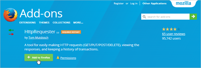 HttpRequester is a simple tool that allows the user to test ProcessMaker endpoints. To use it, it is necesary to install Firefox, then install the HttpRequester add-on by searching for it add-on in Firefox and clicking the Add to Firefox button.
