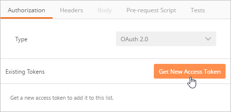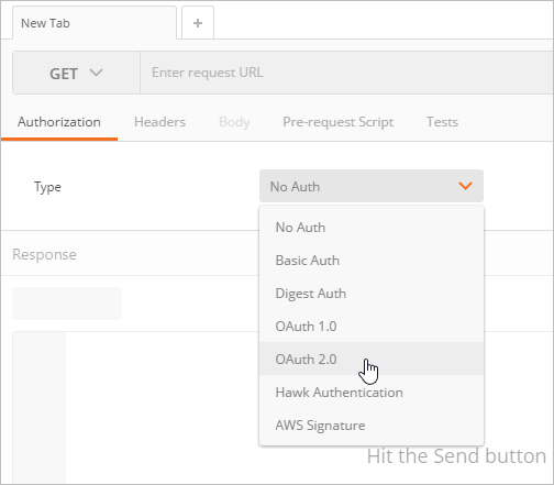 Before performing any API requests, it is necessary to get an authorization token. Therefore, go to the Authorization tab, click on the Type dropdown and select Oauth 2.0.