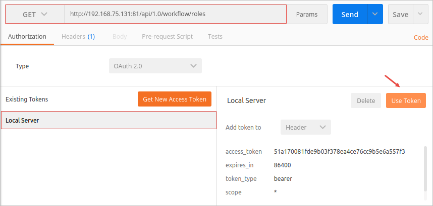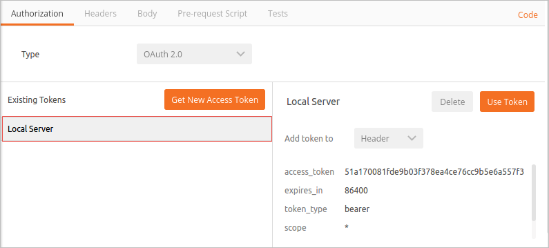 Then, go to the Authorization tab and select the token we got before. The token's information will be displayed at the right side of the window. Select "Header" in the Add token to dropdown and click on Use Token.