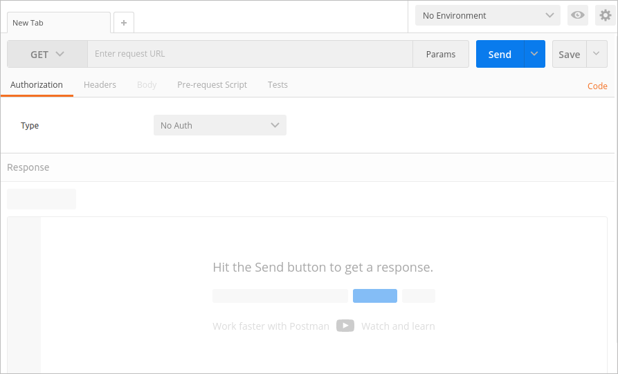 Once logged in, the Postman’s GUI will be displayed. In the top menu, there is a field where the API request can be entered. To the left of the request field, there is a menu where the desired method can be selected (GET, POST, PUT, DELETE, etc). Underneath the request field, there are tabs that can be used to add authorization credentials, headers, a body, and pre-request scripts. On the right side of the request field is the Save button, which saves your API requests for future use.