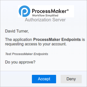 After logging in, the window will be redirected to the OAuth2.0 authorization screen, where the user may authorize the external application to access ProcessMaker. If the user clicks on Accept, a token with the "bearer" type will be generated.