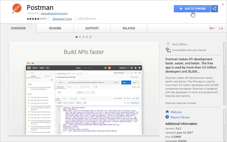Postman is is a popular API client that makes it easy test ProcessMaker APIs. To use it, first install the Google Chrome browser, and then install the Postman Chrome extension by going to the Chrome Web Store and clicking on the Add to chrome button.