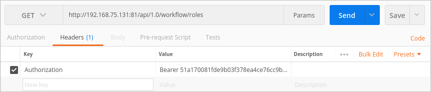 The access token we retrieved before will be placed as the value of the header to give access to our request to the endpoint. In the Value field, write the word Bearer followed by the access token, as in: