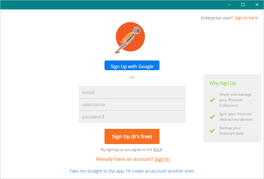 On the login screen, the user can access Postman using his/her Google account, or by creating a new Postman account. To create or use an account later, just click the Take me straight to the app link.