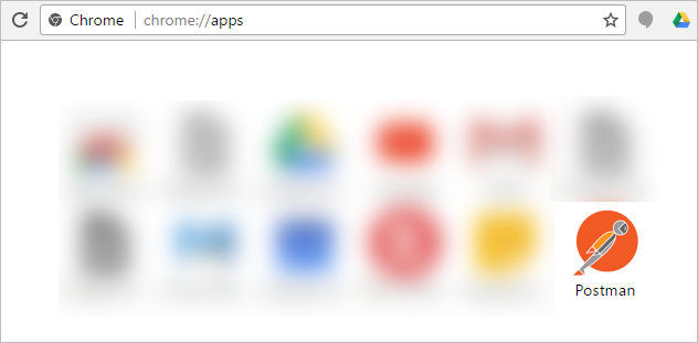 Once installed, the Chrome browser’s Apps page (chrome://apps/) will open displaying the Postman logo in the list of installed extensions. Click on the Postman icon.