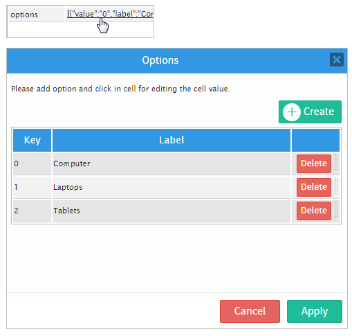 | Options | Define the options that the user will be able to select from in this property. Take into account that if the options are first defined in the designer and then a variable is related to the control, the options will be replaced by the options defined in the variable (the options will be deleted even if the variable has no pre-defined options) . After a variable has been related to the control, it is possible to manually add more variables to the control by defining them in this property, even if the variable has a SQL query defined or variables inside its configuration. Take a look at this documentation to learn how this option works in the designer. |