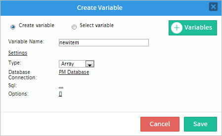 | Data Variable | Available Version: ProcessMaker 3.0.1.8 and on. Assign the array variable using the @@ button.