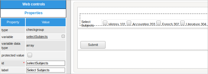 After adding a checkgroup to the design, it is possible to customize its functionality and behavior by configuring its properties.