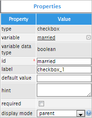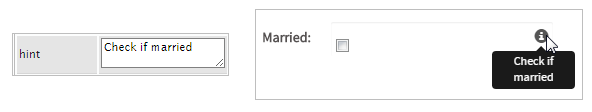 The next property is called "hint", which will be used to show a help message to the user by adding an icon that displays the text added in the property. For example, the hint can be the following text: "Check if married". When running a case, the hint will appear when the pointer of the mouse is hovered over the icon next to the control, as seen in the image below.