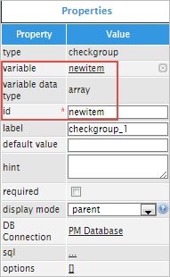 checkgroup000000000X" by default, where "X" represents the corresponding number of the control in the design. This numbering starts at 1. After a variable is related to this control, the ID changes to the name of the variable; nevertheless it is possible to give a new ID to the control.- label: Set to "