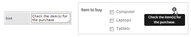 | Hint | Used to show help when the checkbox is rendered. It is shown when the pointer of the mouse is hovered over the ? icon. |