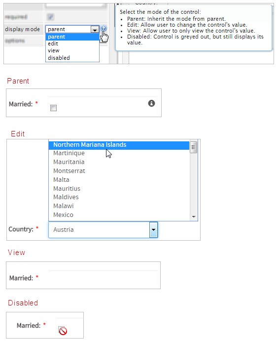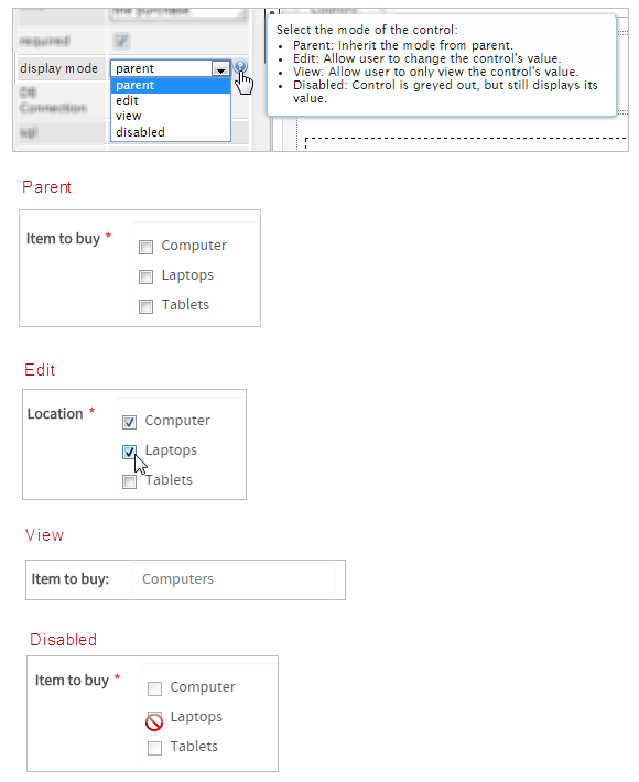 Next is the display mode property, which allows the user to choose the way the control is displayed. If the mouse is hovered over the question mark icon, an explanation of each display mode will be displayed. As seen in the image below, each mode will have the following effects on the control: