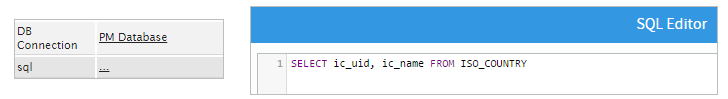 The following properties are the DB Connection property, which is used to select between the list of database connections defined in the process objects, and the sql property, which is used to query values from databases. To demonstrate the use of these properties, a different example will be used. Let's pretend a country needs to be chosen; therefore, a query will be used to call the UID and name of a table named ISO_COUNTRY.