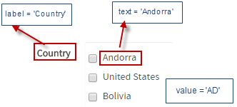 Marks the options by using their text label. For a checkbox, set it to the text label of the marked or unmarked