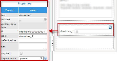 After adding a checkbox to the Dynaform, it is possible to customize its functionality and behavior using the properties panel.