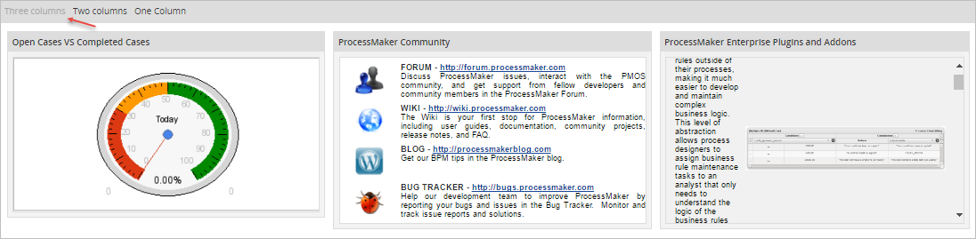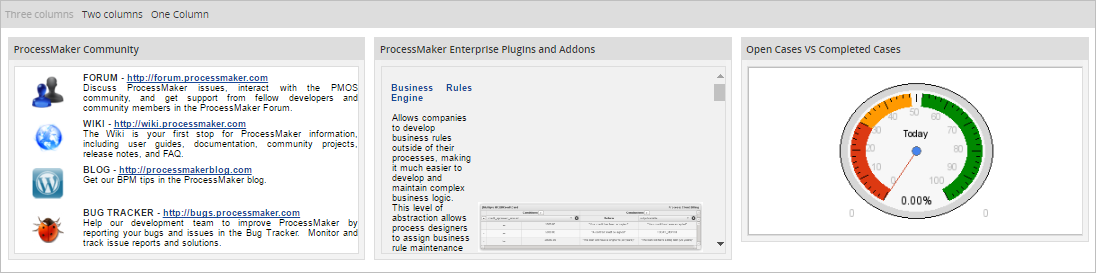 - Three Columns: The Dashlets are displayed in three columns as shown in the image below: