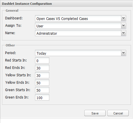 - Period: Shows the period of time calculated for each dashlet. For example, if This year is selected, the Dashlet will show all the open and completed cases for the current year.