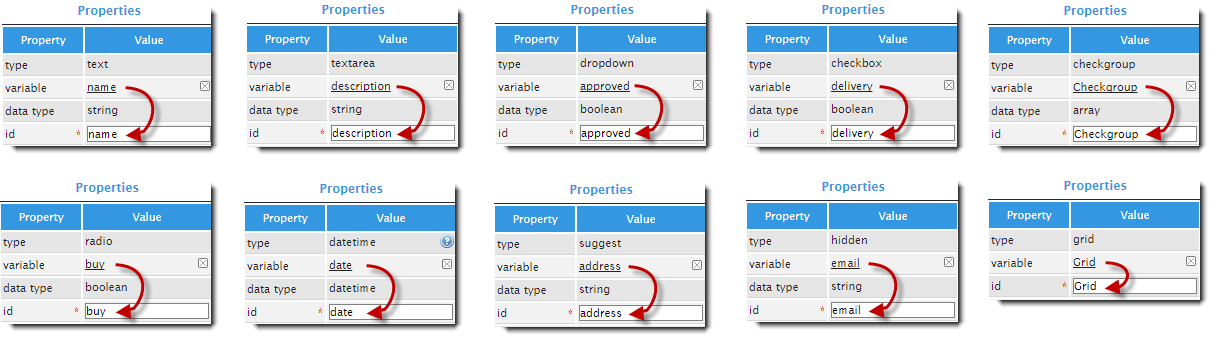 The controls Text and TextArea, Dropdown, Checkbox, Checkgroup, Radio, Datetime, Suggest, Hidden and Grid will have different variable types.