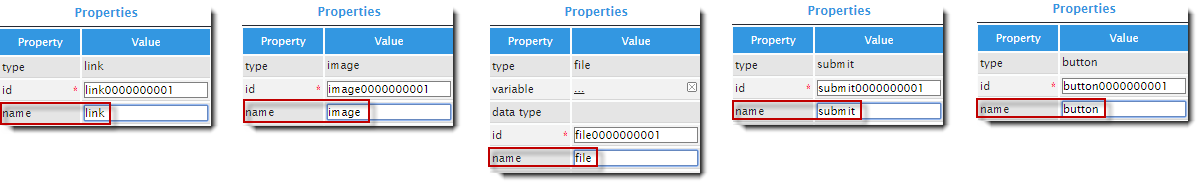 It is possible to add a name to some controls managed inside the designer. By default, the control with this property has the same name as the ID set by default. When the ID is changed by the user, the name does not change and keeps its original configuration. The name can also be changed by entering a new value in the property.