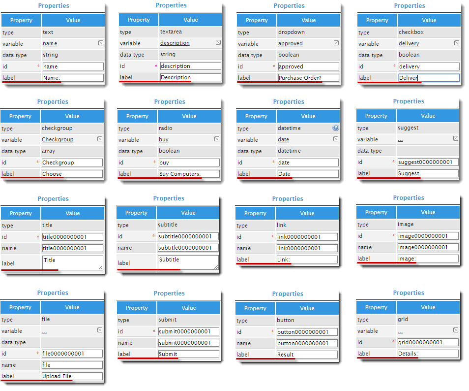 | Available in Controls: Text and TextArea, Dropdown, Checkbox, Checkgroup, Radio (group), Datetime, Suggest, Title and Subtitle, Link, Image, File, Submit and Button, Grid |