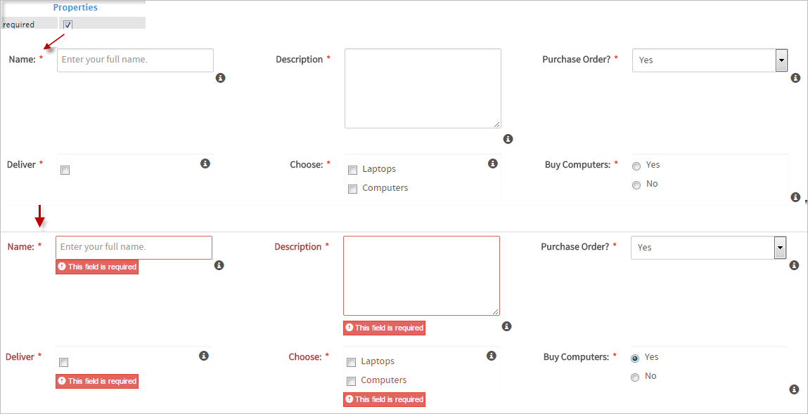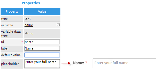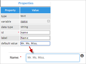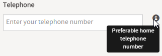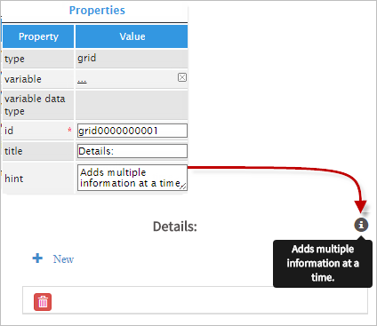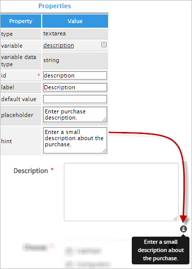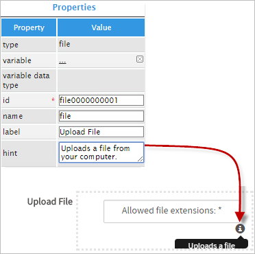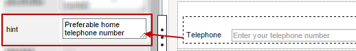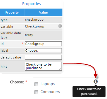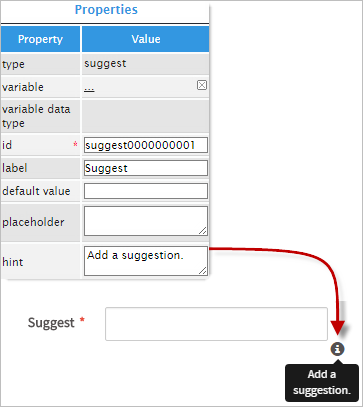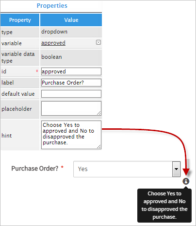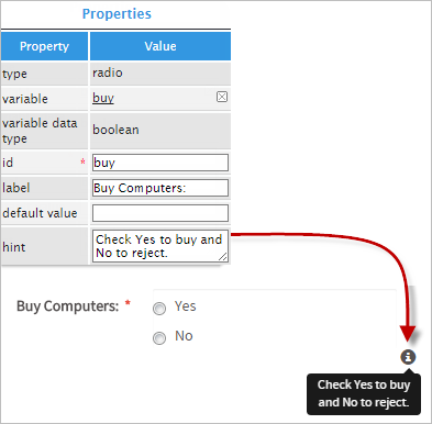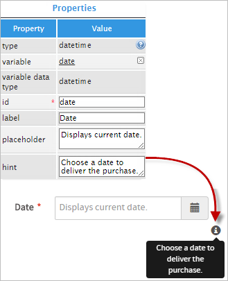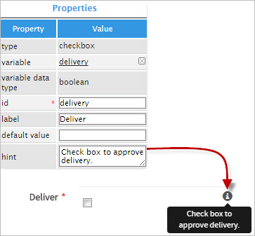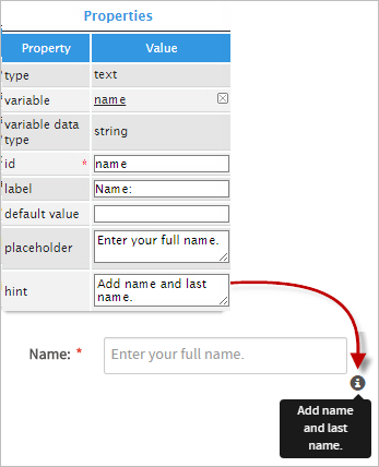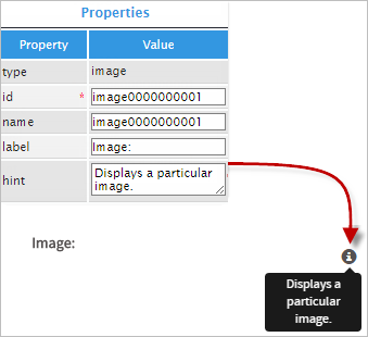 This property displays helpful hints to guide users when entering values into the control fields. A hint can be used to provide a fuller explanation of the field or to indicate what values are acceptable for the field. When a field has this property enabled, an ? icon appears to the right of the field only when the form is rendered. The hint message pops up only when a mouse pointer hovers over the icon.