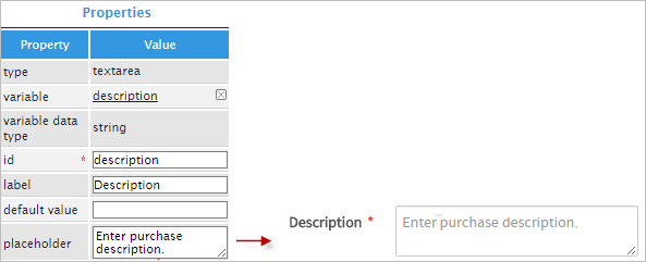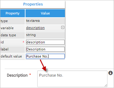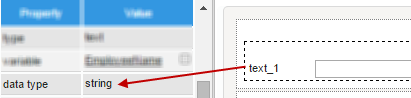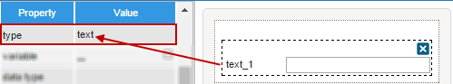 This property simply describes what type of control it is, and is automatically set when the control is added to the design. The value of the Type property is always the name of the control (in the image, the control is "text area", therefore, the value in the Type property is "text"), and cannot be changed by the user.