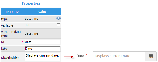 | Label | Default Value | Placeholder | Hint | Validate | Error Message | Max Length | Title | Format | Min Date | Max Date | Default Date | Href | |