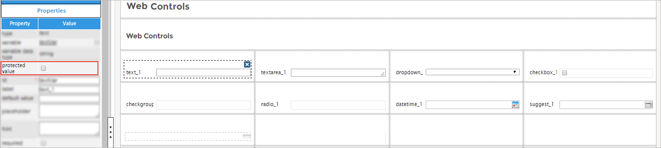 As of version 3.0.1.8, the "protected value" property is available to protect the information stored in variables. If the "protected value" field is checked, the variable cannot be modified or changed, thus protecting the written value. This will avoid security issues with the data and safeguard the integrity of the values in case an SQL, HTML or Javascript injection is used.
