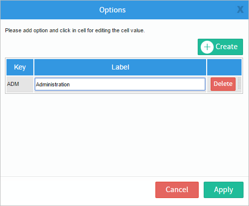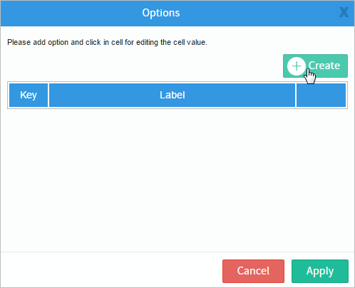 A row with the fields enabled to add options appears below. After setting the "Key" and the "Label" simply press "Enter" to add the option.