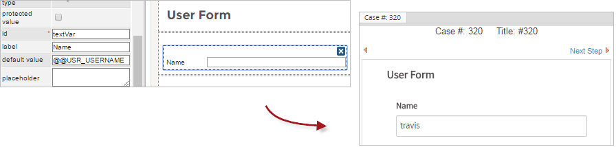 For example, the variable @@USR_USERNAME can be assigned to the "Default Value" property of a Textbox control. When running the case, the Textbox field will display the name of the current user as the default value.
