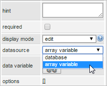 The Datasource property defines the origin of the control values. This property has the following possible options: "Database" or "Array Variable".