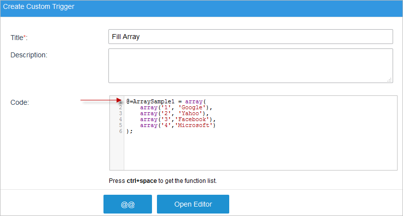 Then, create a Custom Trigger with the name "FillArray" and inside the code, assign an array of values to the ArraySample1 variable.