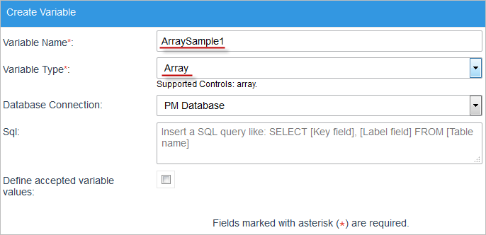 Finally, select the option "Array Variable" inside the "Datasource" property of the Dropdown in the Dynaform and choose the variable ArraySample1 from the window list. The dropdown will display the values array that was assigned to the variable.