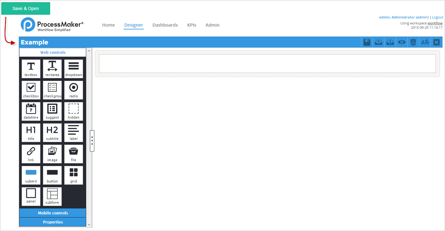 - Save and Open: It saves the configuration made over the new Dynaform and it opens the HTML5/Responsive Dynaforms editor.