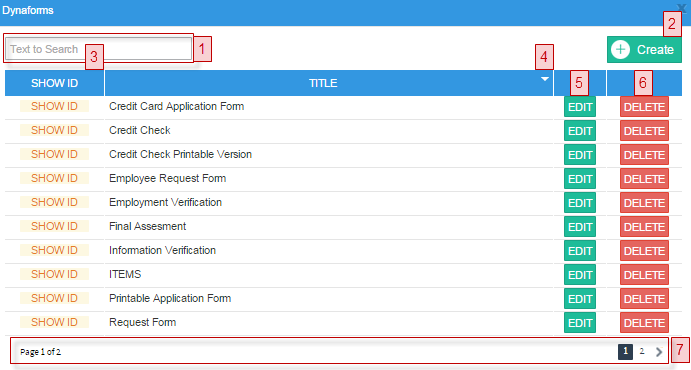 - Pagination: When more than 10 Dynaforms are listed, a new page is created. To navigate through the pages use the > or < options or click over the page number in order to look for a Dynaform.