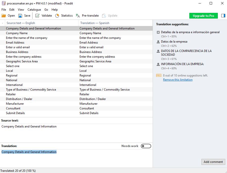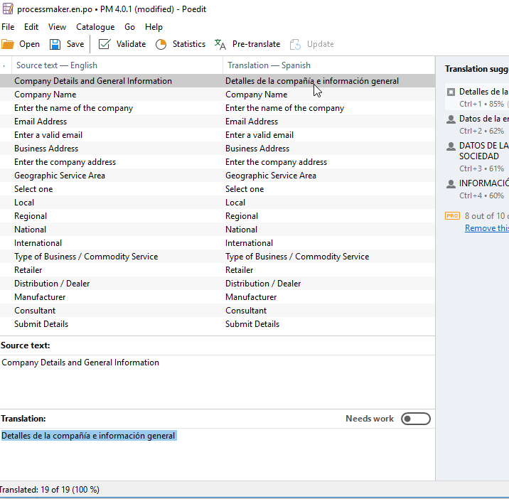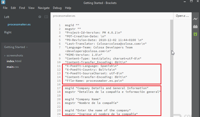 Example: Add these strings to the processmaker.es.po file in your favorite editor.