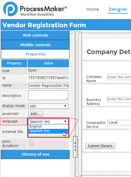 Multi-Language Support is a feature that allows translation files to switch the language of the Dynaform according to your needs. Designers can download a .po file with labels created within the Dynaform and perform the corresponding translation for any language. The translation file is used without needing to create a new form for that language.
