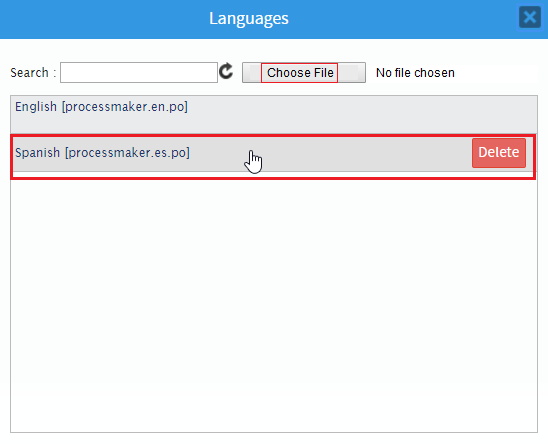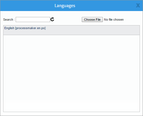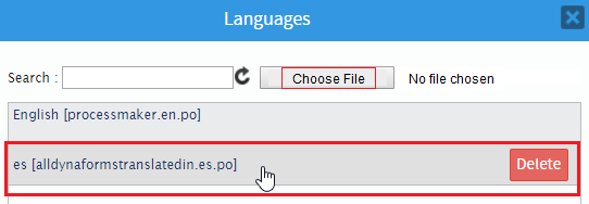 option in the Dynaform menu. The Languages window displays. - 2. Choose File to upload the processmaker.es.po file created as an example. The new translation file uploaded to the Dynaform and listed in the panel, as shown in the image below: