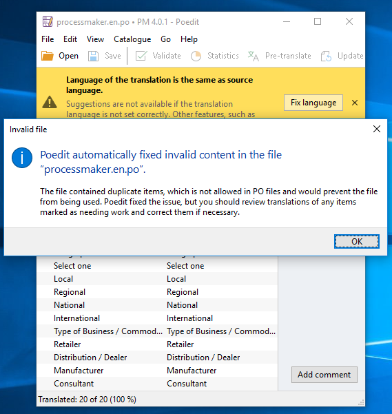 - 3. Poedit displays an Invalid file message. Click OK to continue.