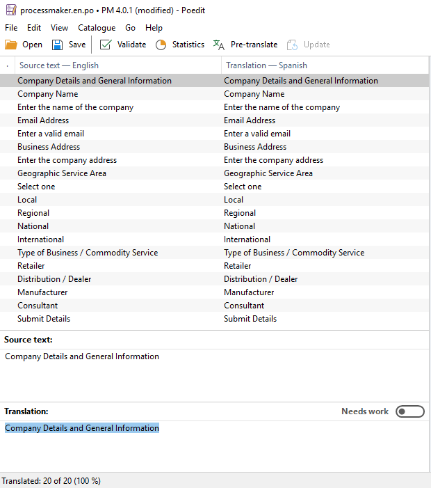 After you have added all these strings, save the file with a filename according to your needs. In this example, the name is alldynaformstranslatedin.es. Open the .po file into Poedit editor, save it with format .po, and then upload the file into the Dynaform.