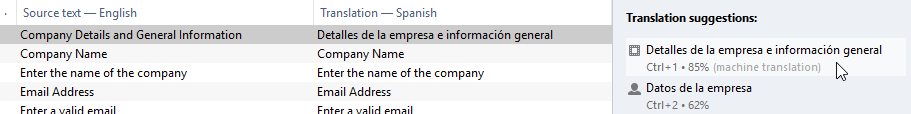 - 13. Select a sentence to translate from English to the target language. (in this example into Spanish). Suggestions appear in the Translation suggestions section. If the translations suggested are not displayed, go to View > Show sidebar menu, or press Alt+Ctrl+S keys.