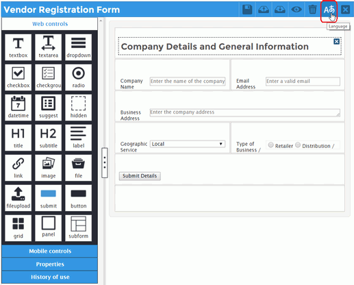 The Language option is at the top of the Dynaform designer, in the right-hand corner of the window.