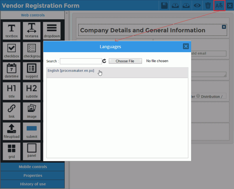 When a .po file is created, it is named processmaker.en.po by default and its header is set to the English language by default (although the original strings in the form may not be in English). Use the Languages window in the following ways: